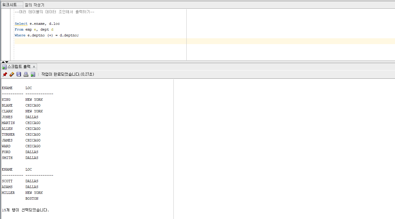 => BOSTON이 출력되지 않은 이유는 EMP테이블에 40번 부서 번호가 없어서 DEPT 테이블과 조인이 되지 않았기 때!