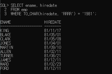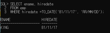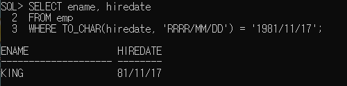 where TO_CHAR (hiredate, 'RRRR/MM/DD') = '1981/11/17'