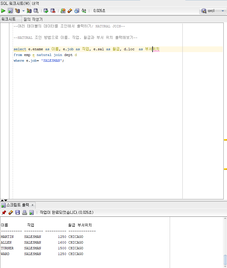 조인 조건을 명시적으로 작성하지 않아도 FROM 절에 EMP와 DEPT 사이에 NATURAL JOIN을 기술하면 조인이 된다...!