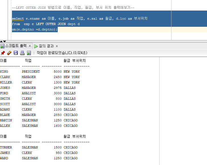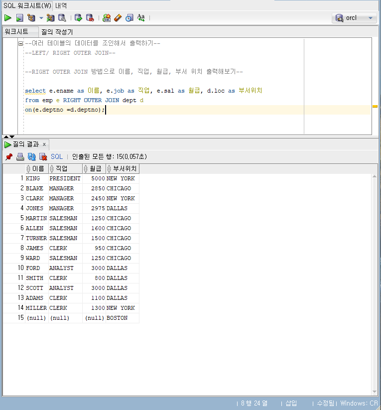 RIGHT OUTER JOIN 방법으로 이름, 직업, 월급, 부서 위치 출력해보기