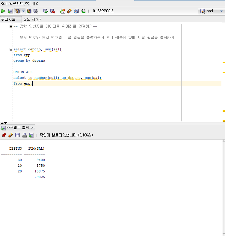 위 쿼리 = 부서 번호와 부서 번호별 토탈 월급을 출력하는 위쪽 쿼리의 결과 + 전체 토탈 월급을 출력하는 아래쪽 쿼리의 결과