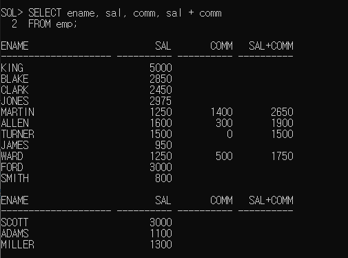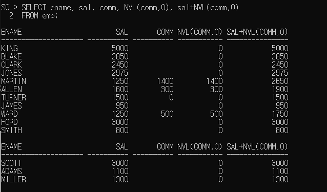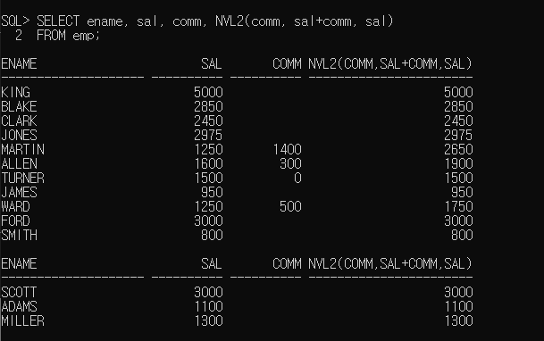 NVL2 함수를 이용하면, 커미션이 0이 아닌 사원들은 sal+comm출력, NULL인 사원들은 sal을 출력할 수 있다