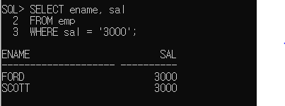 sal(월급)은 숫자형 데이터 컬럼인데, "3000"을 문자형으로 비교한다. sal = '3000'으로 잘 못 비교해 오류가 날 것 같지만,