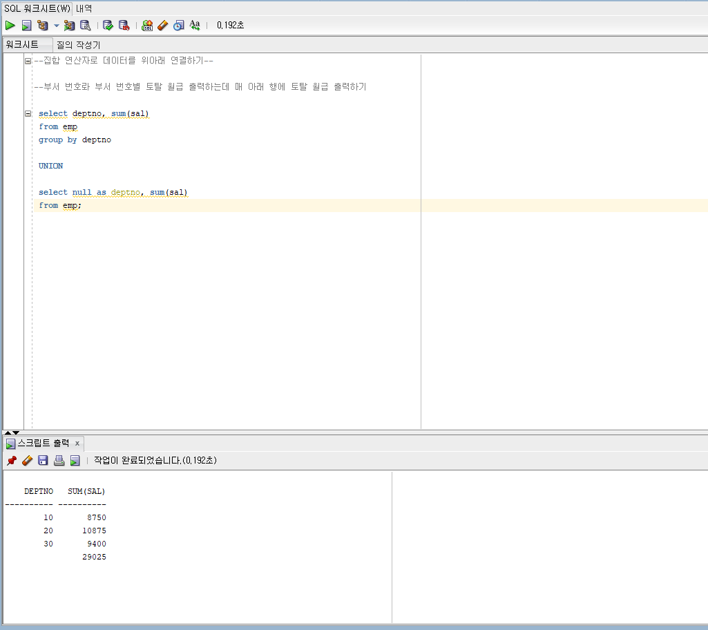 UNION ALL과 다르게 부서 번호가 내림차순...!