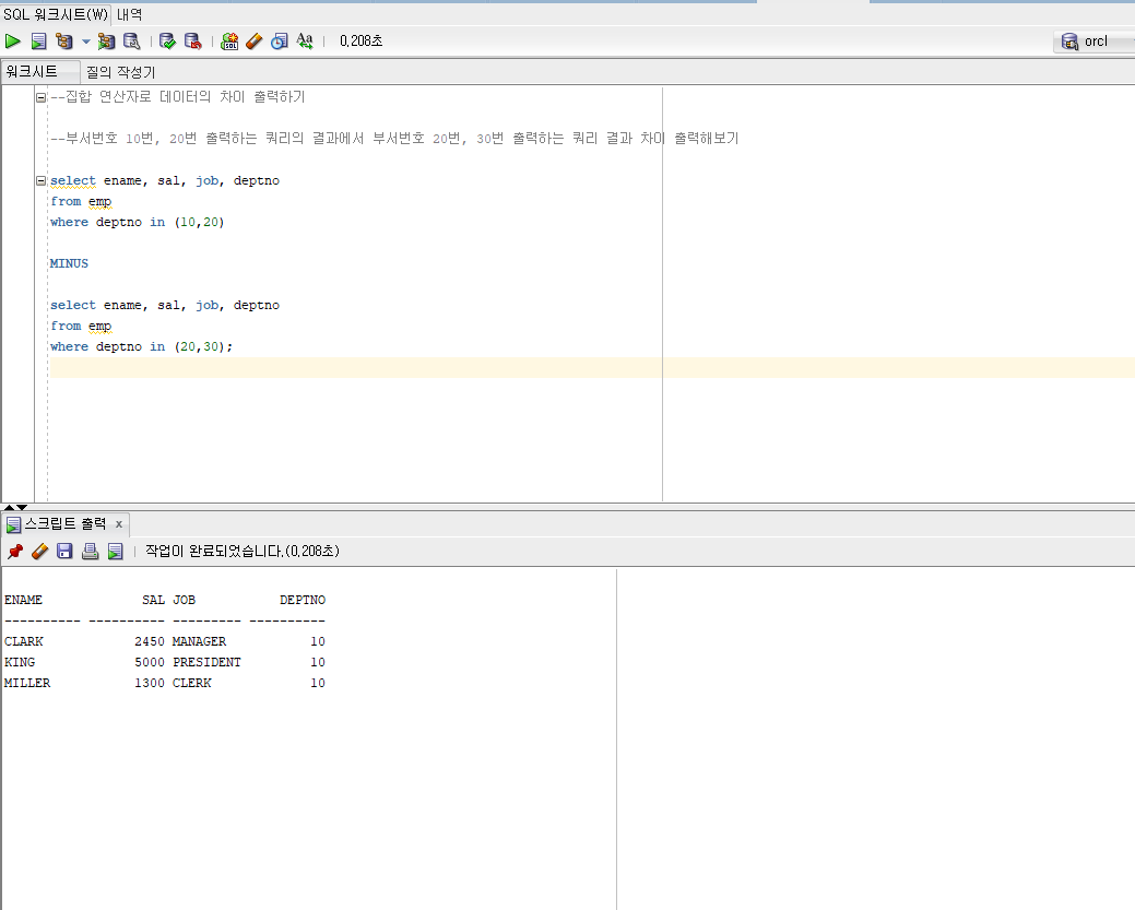 MINUS 연산자 위쪽 쿼리를 A 집합. MINUS 연산자 아래쪽 쿼리를 B집합이라 한다면 A-B 가되는것