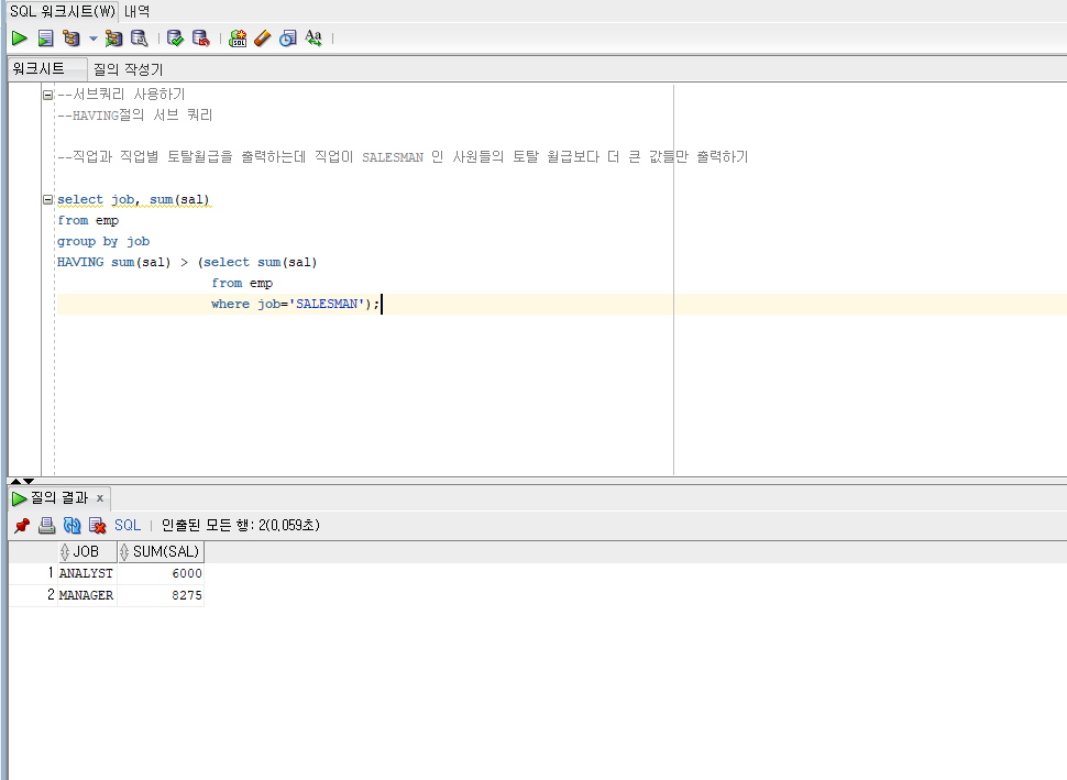 직업과 직업별 토탈월급을 출력하는데 직업이 SALESMAN 인 사원들의 토탈 월급보다 더 큰 값들만 출력하기