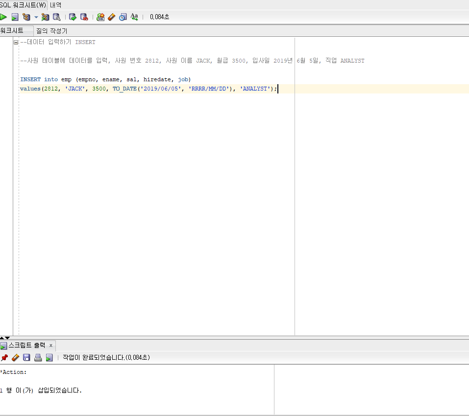 사원 테이블에 데이터를 입력, 사원 번호 2812, 사원 이름 JACK, 월급 3500, 입사일 2019년 6월 5일, 직업 ANALYST