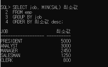 2. 직업과 직업별 최소 월급을, 최소 월급이 높은 순으로 정렬하여 출력 하고자 한다,
