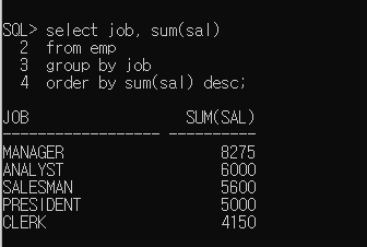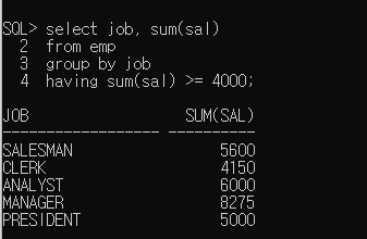 직업별 토탈 월급 4000 이상 → having sum(sal) >= 4000