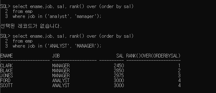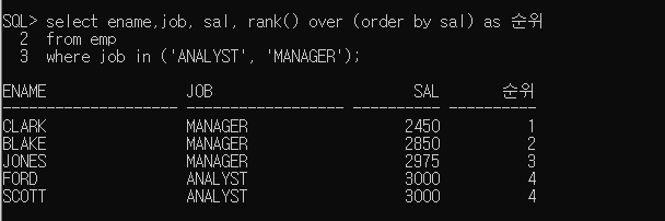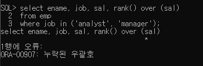 rank() over (sal) 만 작성해서 오류가 발생했다.