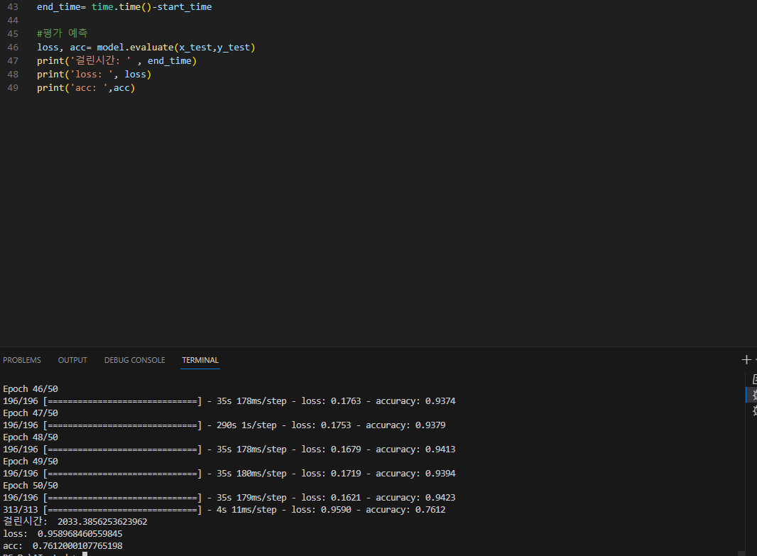 ▶epochs의 증가, MaxPooling 위의 dropout 크기감소, MaxPooling 아래의 dropout 증가가 모두 영향을 끼친거같다 조금 더 성능 향상을 이뤘다, 다음 실행에선 batch_size를 줄여 정확도를 더 높여봐야겠다
