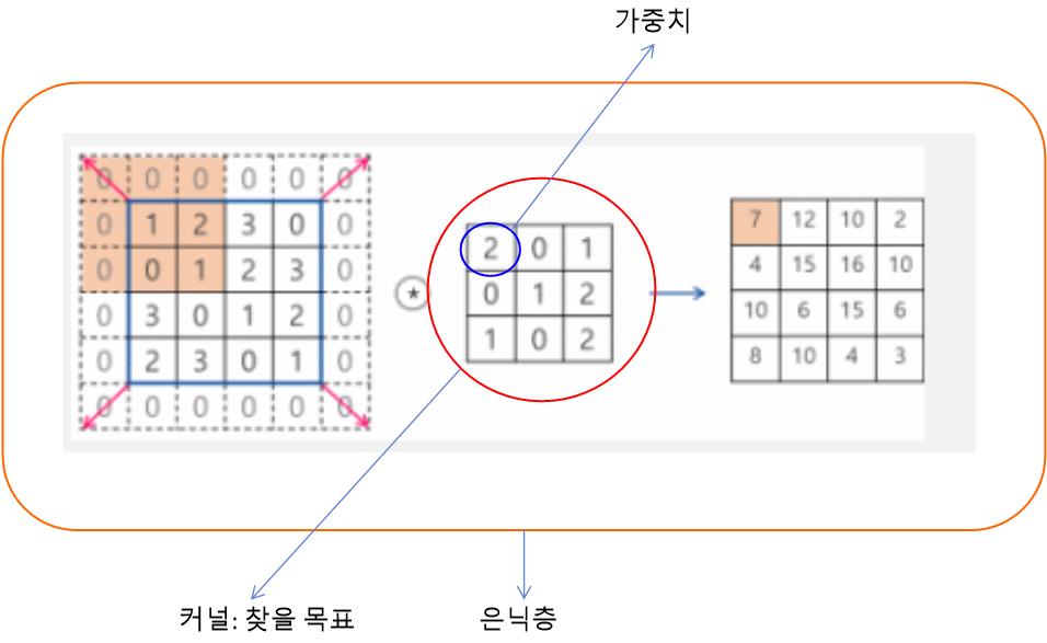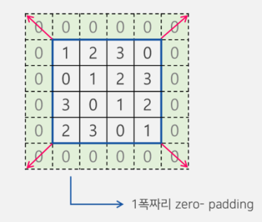 - 합성곱 연산을 수행하기 전, 입력데이터 주변을 특정값 으로 채워 늘리는 것
