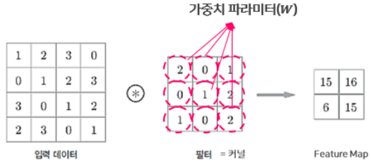 - 입력데이터에 필터를 적용하여 필터와 유사한 이미지의 영역을 강조하는 특성맵(feature map)을 출력 하여 다음 층(layer)으로 전달