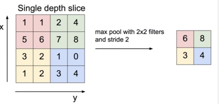 위의 이미지는 2 x 2 filter로 2 stride를 적용하여 4x4 이미지를 2x2이미지로 변환한 예제