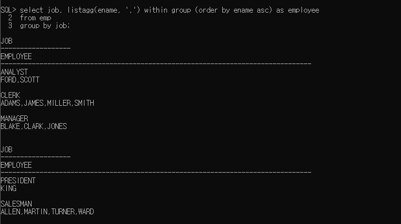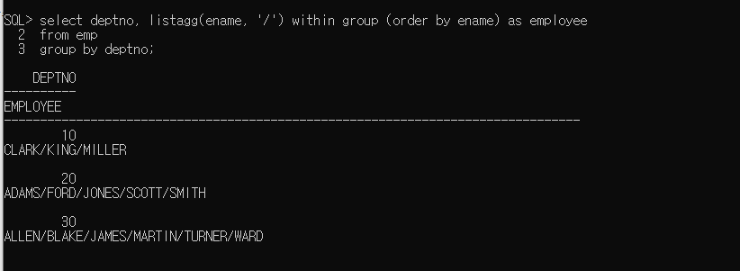 -group by 절이 listagg 함수사용에 필수로 동반되어야 함