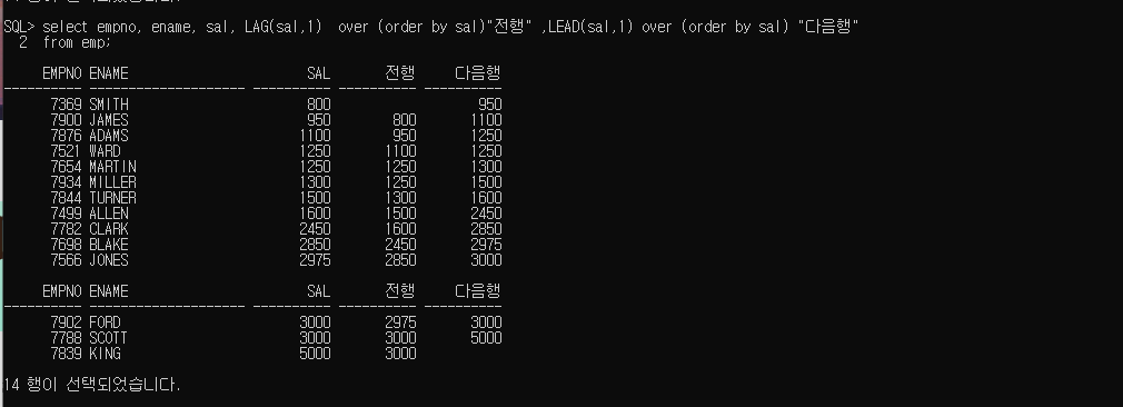1. 사원 번호, 이름, 월급을 출력하고 그 옆에 바로 전 행의 월급을 출력하고, 또 옆에 바로 다음 행의 월급 출력하기