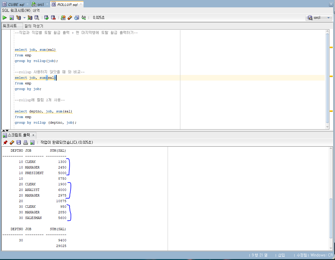 | 집계 결과 | 1 | deptno, job | 부서 번호별 직업별 토탈 월급 |