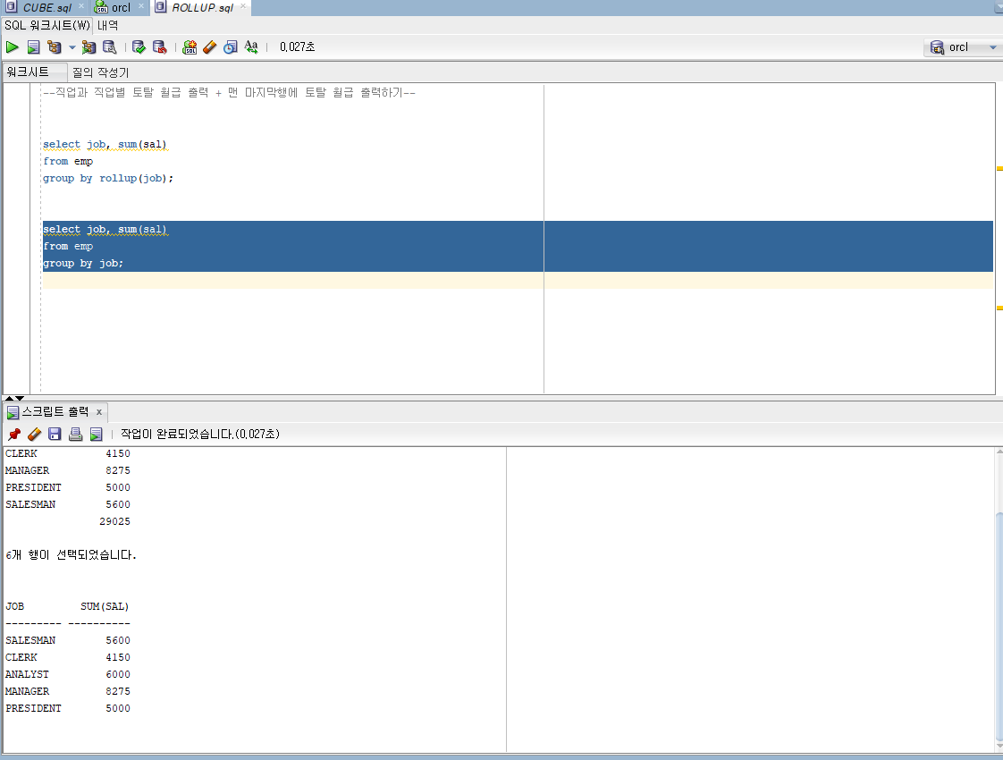 rollup 명령어 사용 시 job 컬럼 데이터 또한 오름차순으로 정렬되어 출력되는거 볼 수 있다.