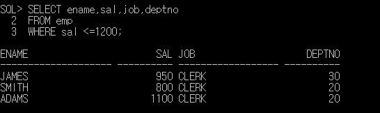 3.월급이 1200 이하인 사원들의 이름과 월급, 직업, 부서 번호 출력