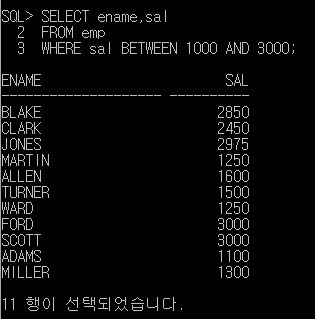 4.월급이 1000에서 3000 사이인 사원들의 이름과 월급 출력