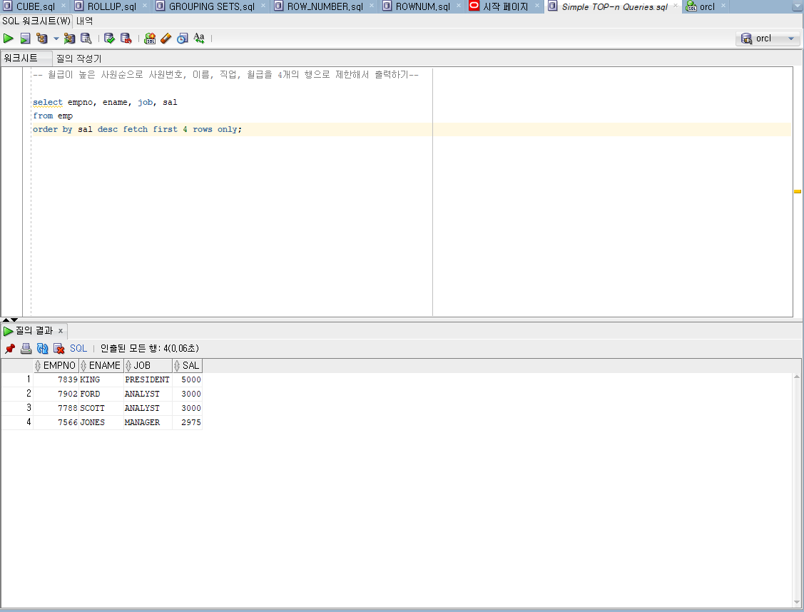 rownum을 이용하면 복잡해지지만, fetch first nrows only를 통해 간편하게 출력이 가능하다