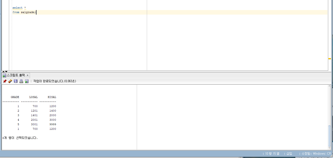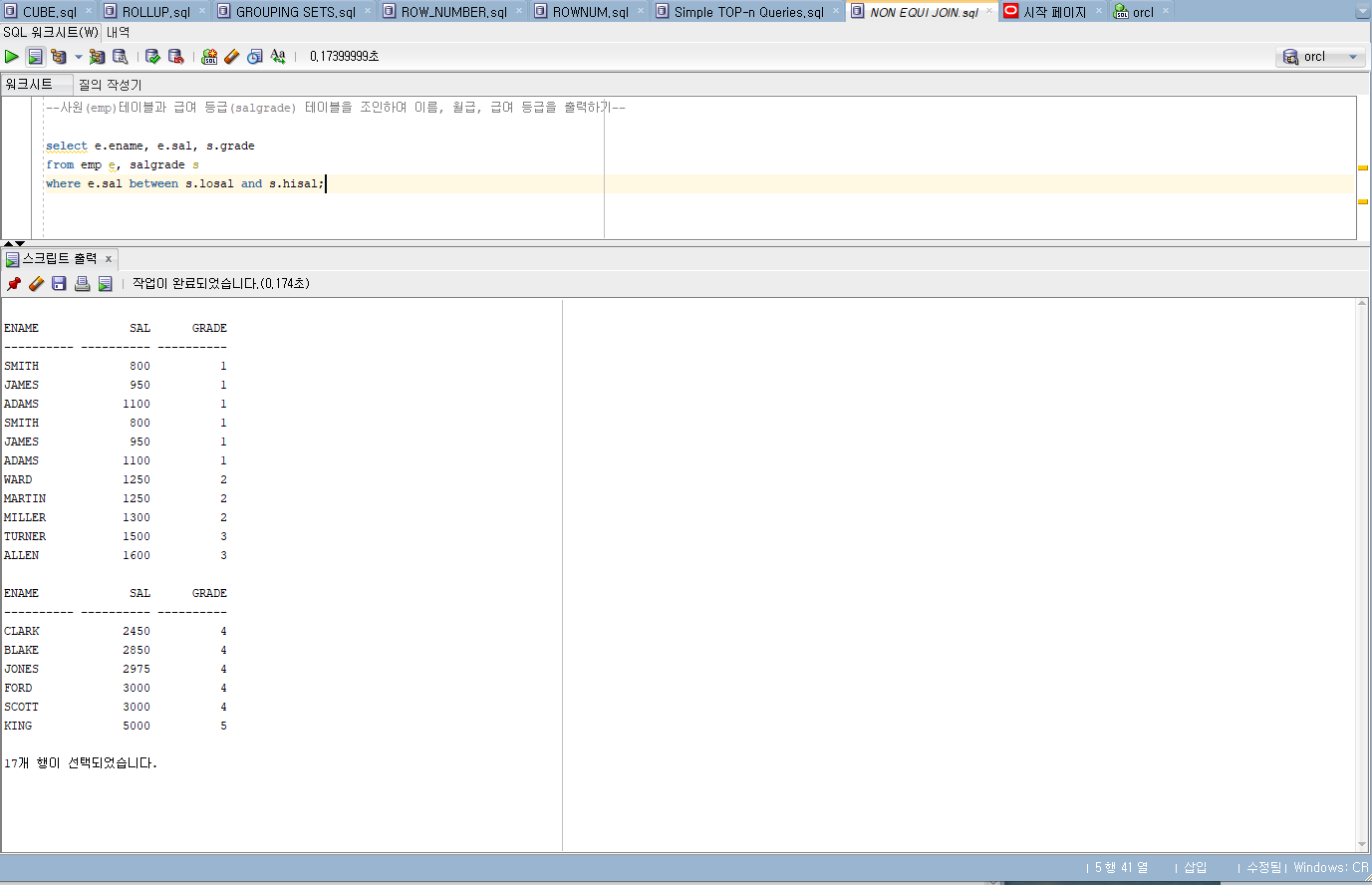 emp의 sal r컬럼과 salgrade의 losal. hisal 컬럼 -> emp 테이블의 월급은 lowsal과 hisal사이에 존재
